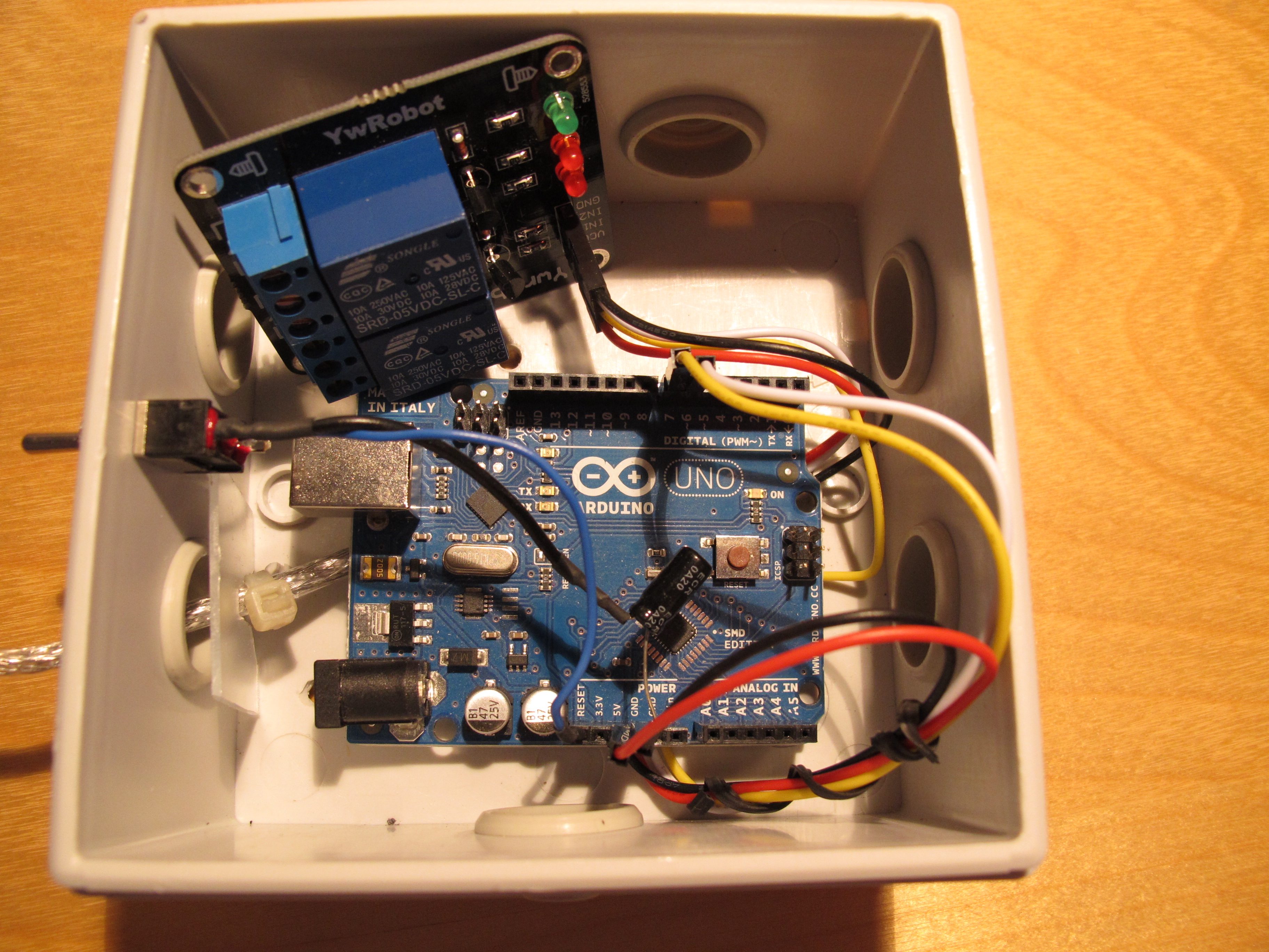 04/2016 : l'Arduino étant désormais sur un support en bois, j'ai mis dans une boîte électrique le relais pour l'éloigner du circuit basse tension et améliorer l'isolation pour y faire passer du 220 V. D'un coté, une prise électrique mâle est réliée au bornier du relais et en ressort une prise femelle à destination de l'apareil à brancher. Le pilotage est assuré par 2 fils basse tension reliés à l'Arduino (non présents sur la photo ci-dessous).