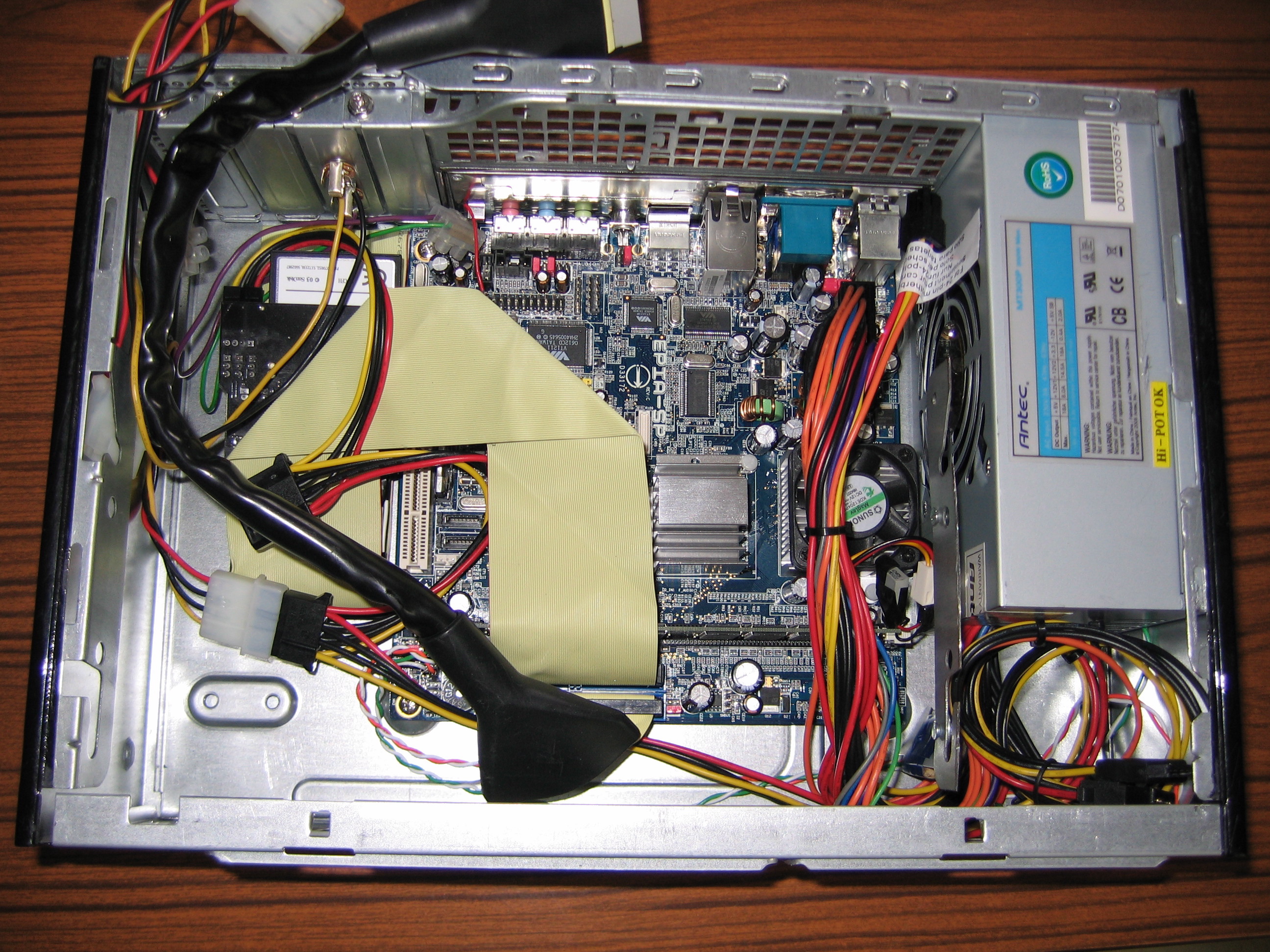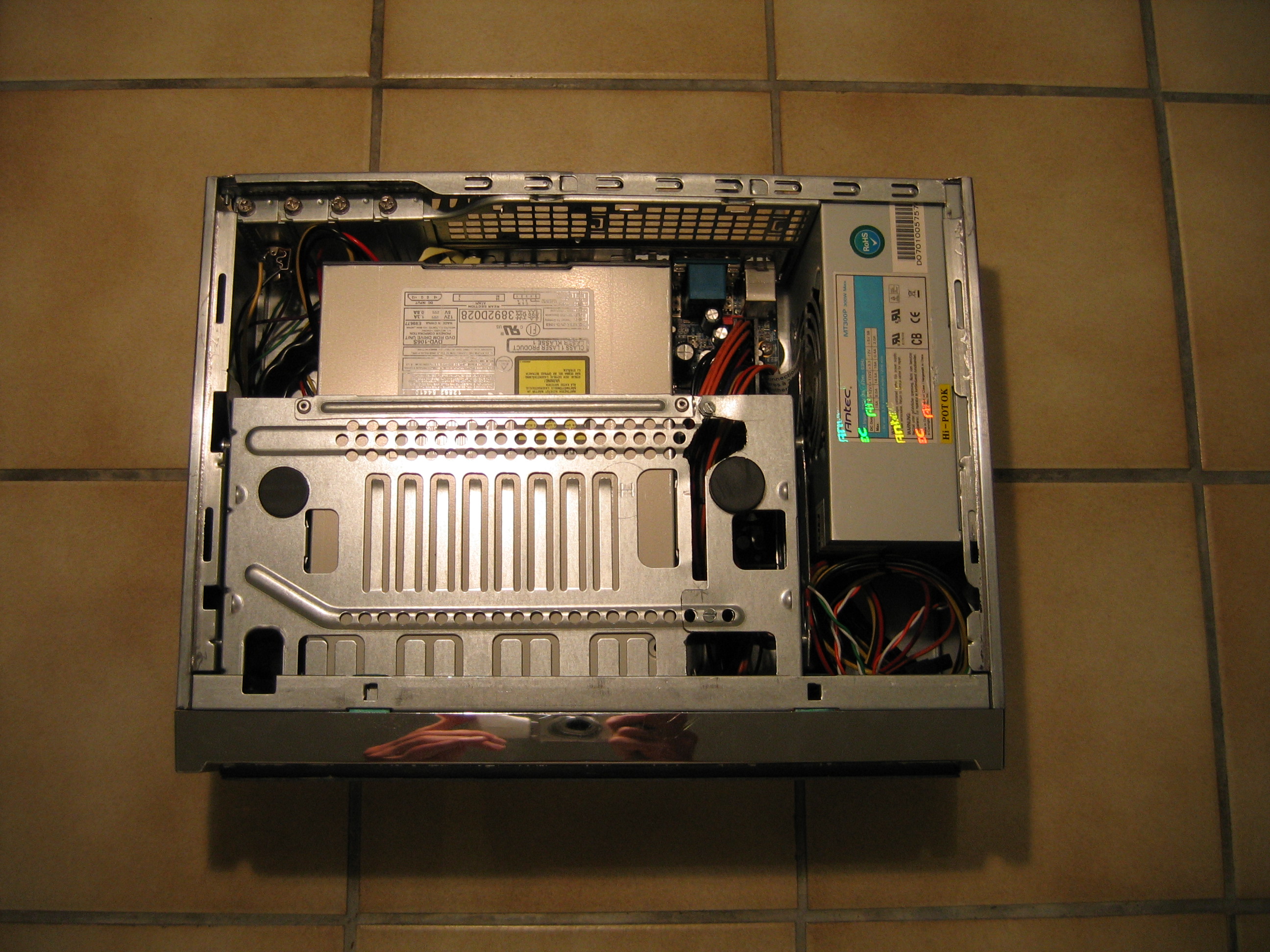 Ce premier boitier, un Morex Cubid 3688 Silver, d'une taille réduite adapté à la carte mini-itx est équipé d'une alimentation de 67W. Mais la carte mère ne démarrait pas car l'alimentation n'était pas assez puissante. J'ai opté pour un Antec Minuet 300 avec une alimentation de 300W, ce qui fut, cette fois, amplement suffisant.