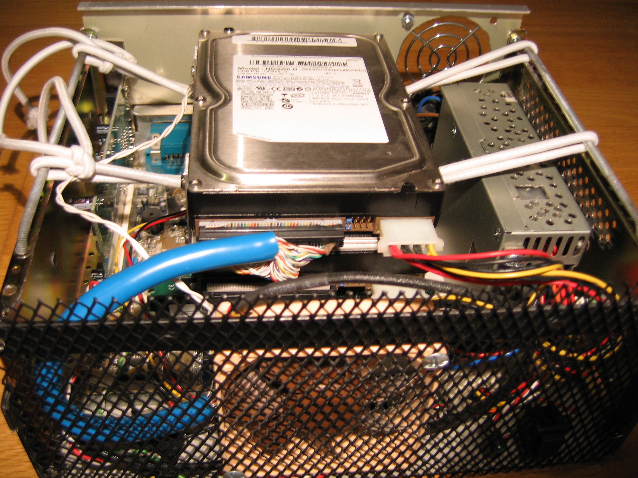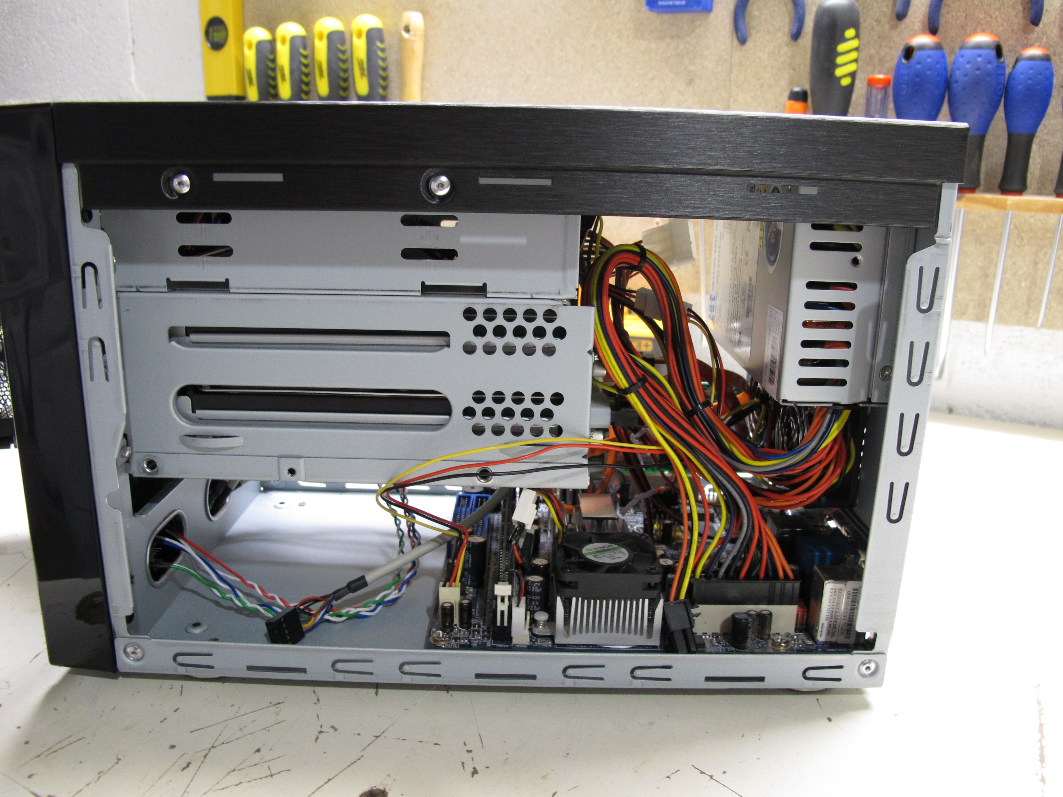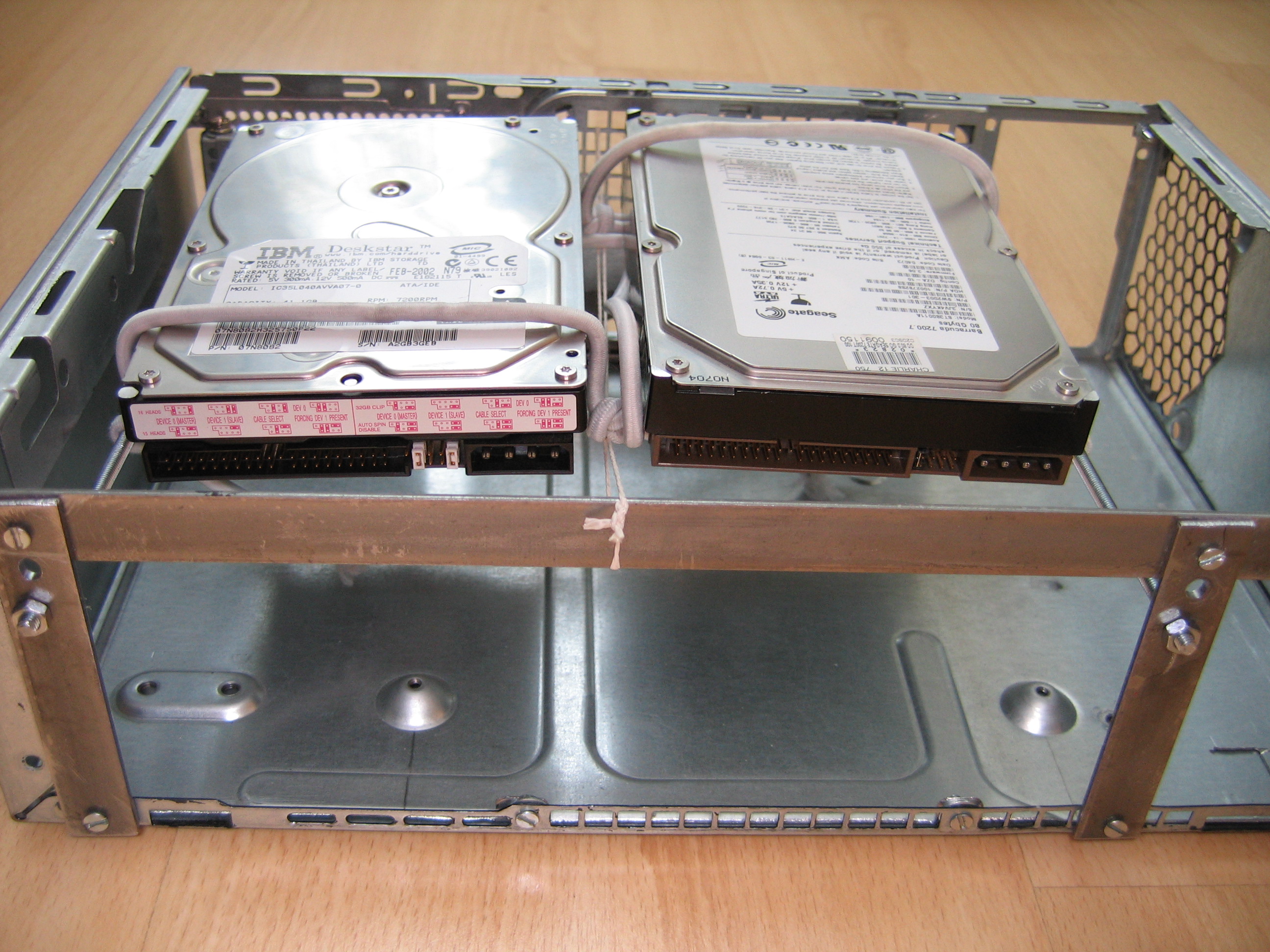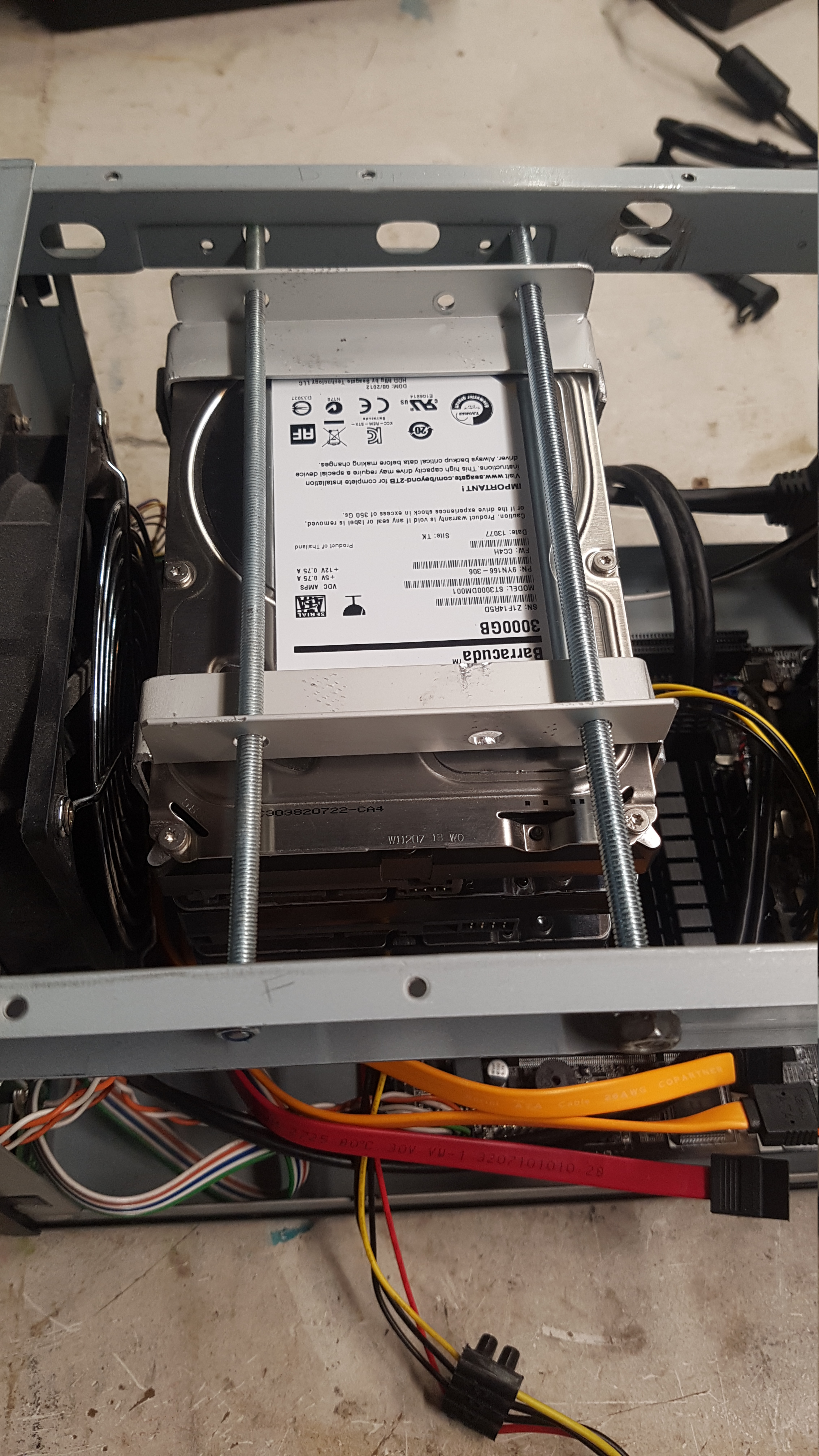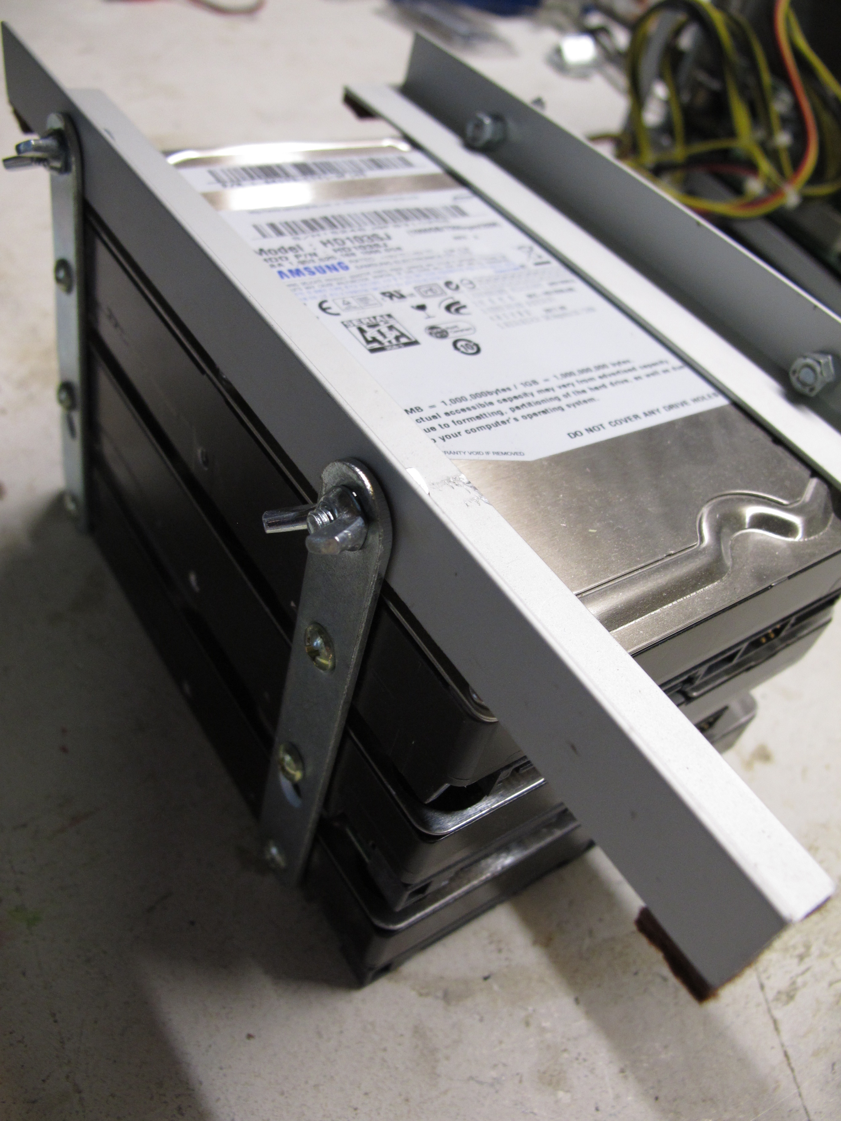 J'ai enlevé le berceau intérieur destiné à supporter un lecteur DVD et un dd 2.5“ et l'ai remplacé par une fixation des disques durs via des plaques de métal afin de les empiler verticalement. Le tout est suspendu avec de la ficelle à rôti et gros élastique.