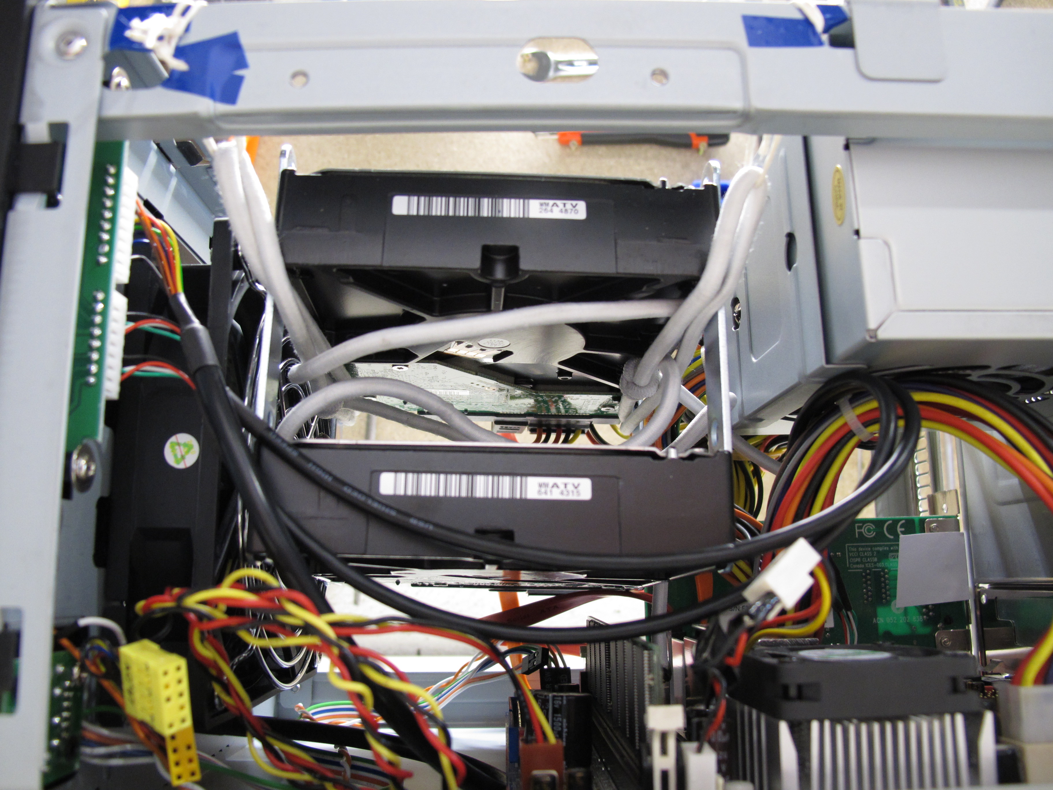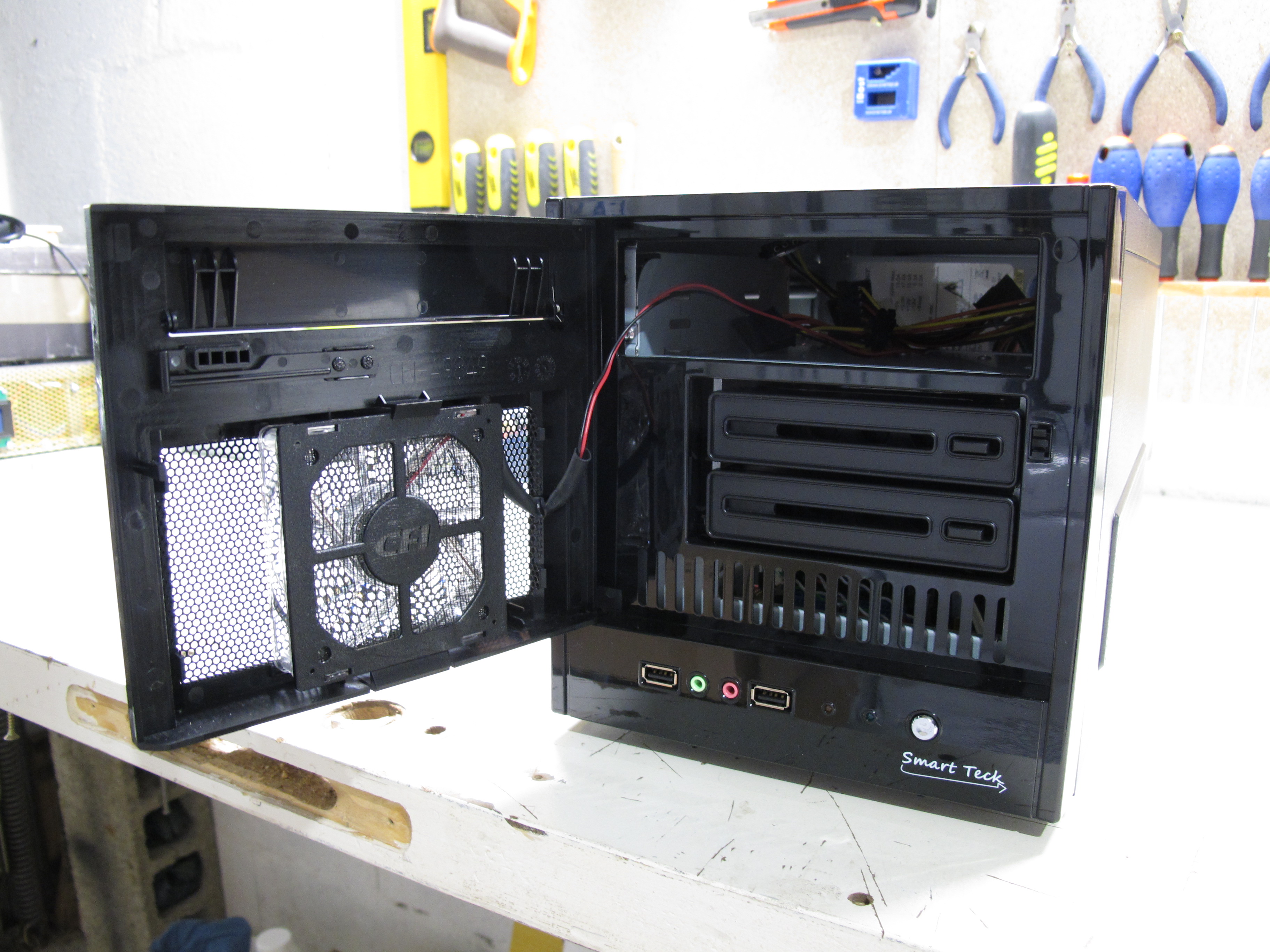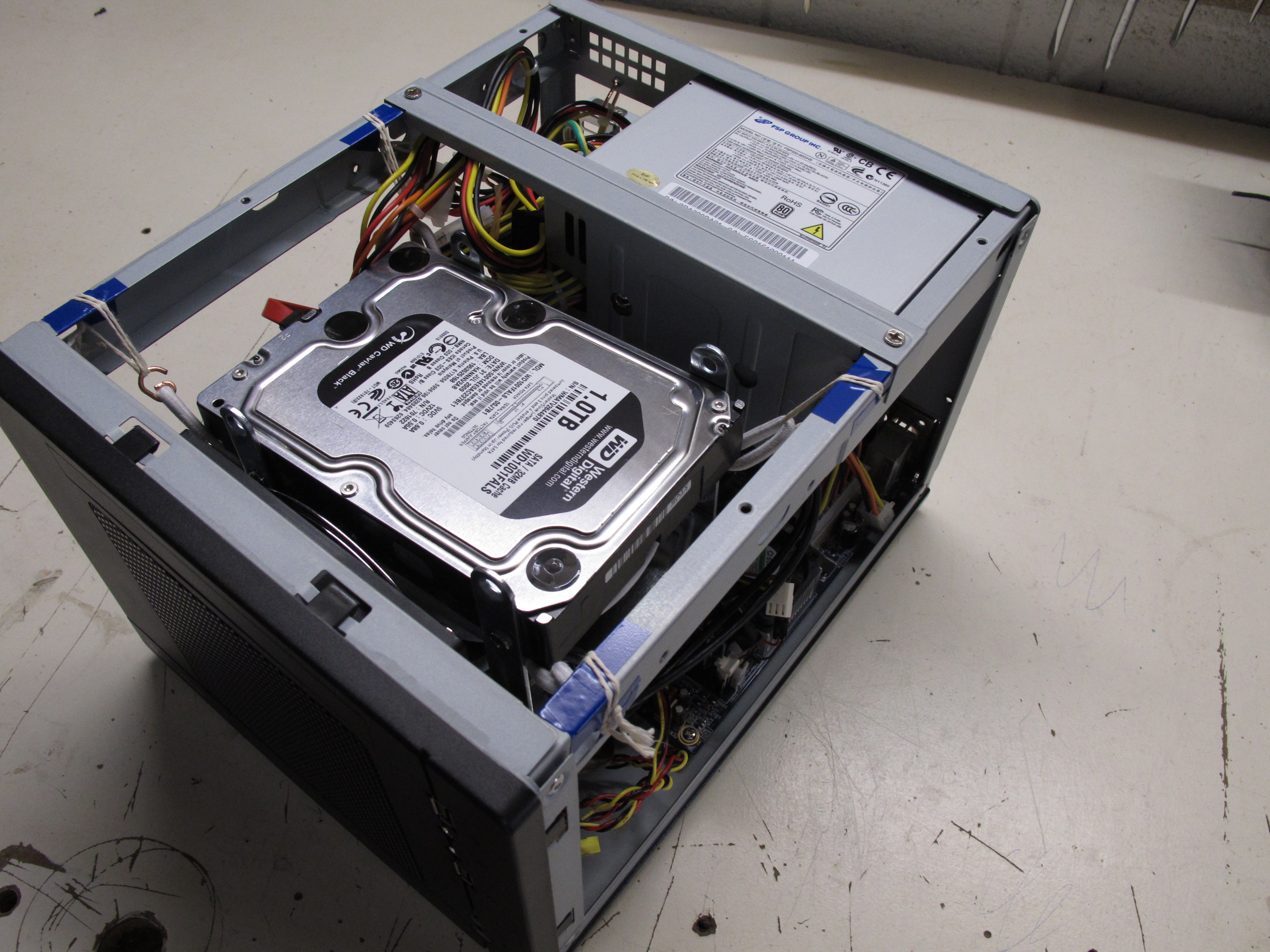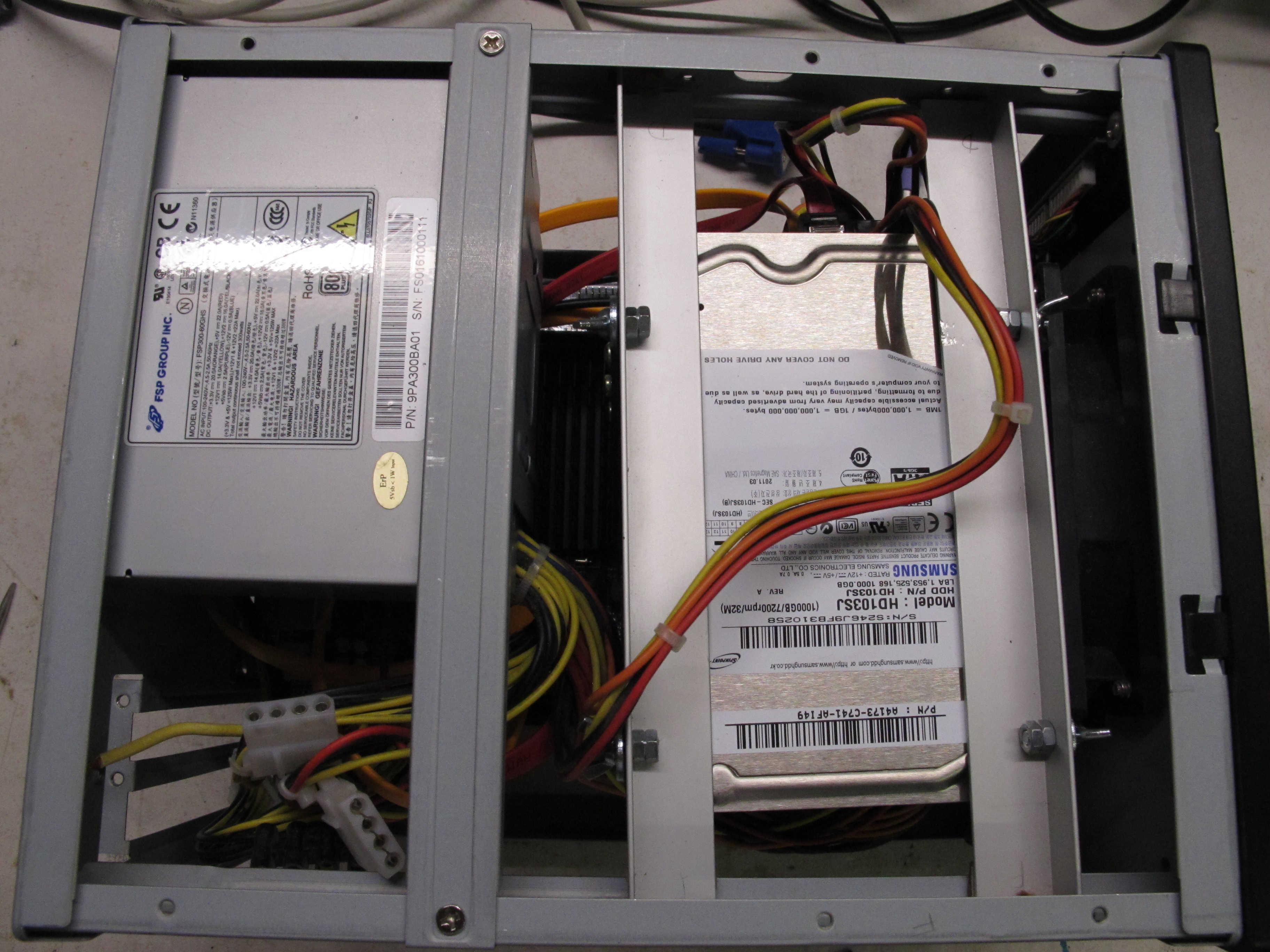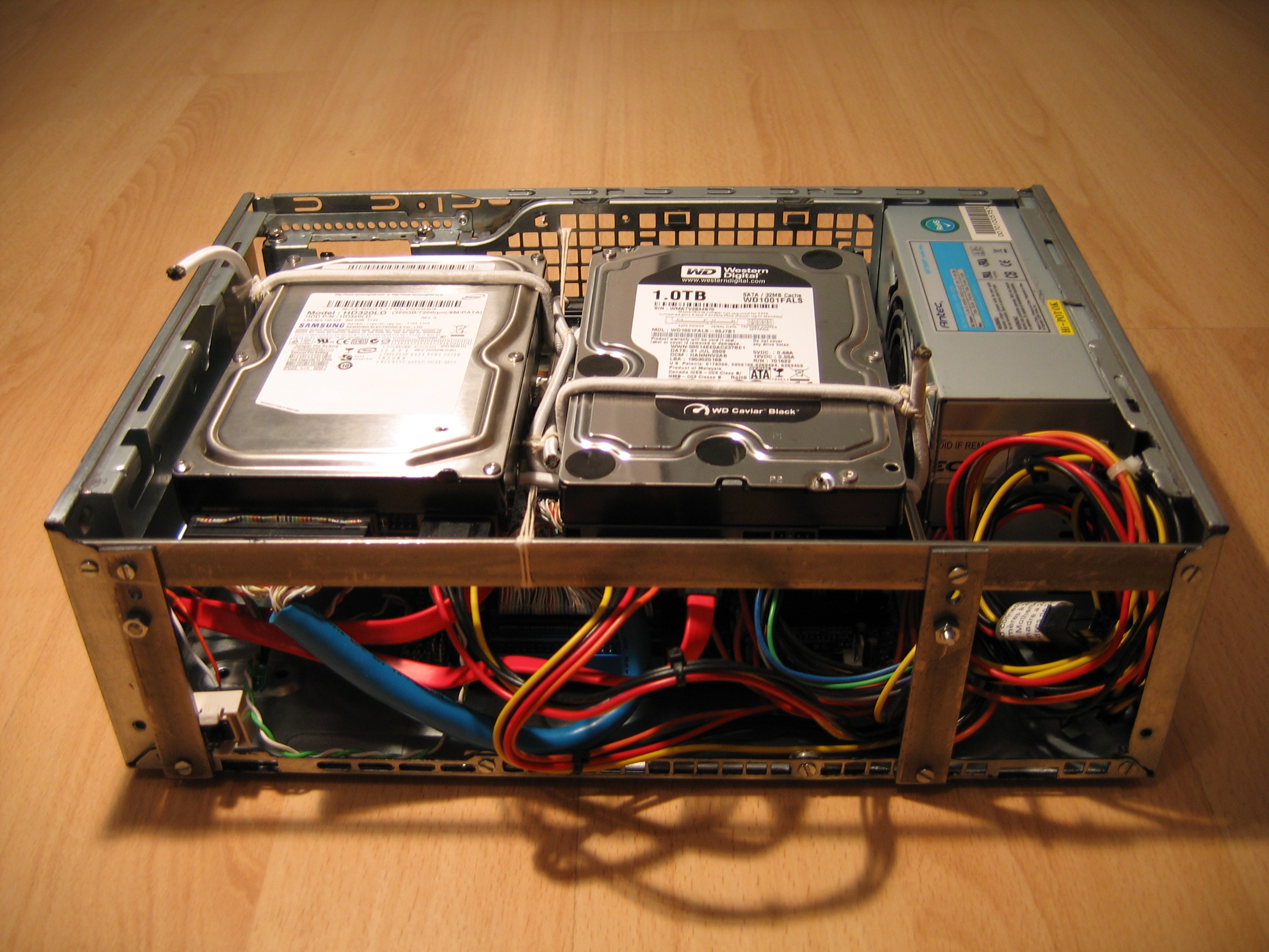 J'ai enlevé le berceau intérieur destiné à supporter un lecteur DVD et un dd 2.5“ et l'ai remplacé par une fixation des disques durs via des plaques de métal afin de les empiler verticalement. Le tout est suspendu avec de la ficelle à rôti et gros élastique.