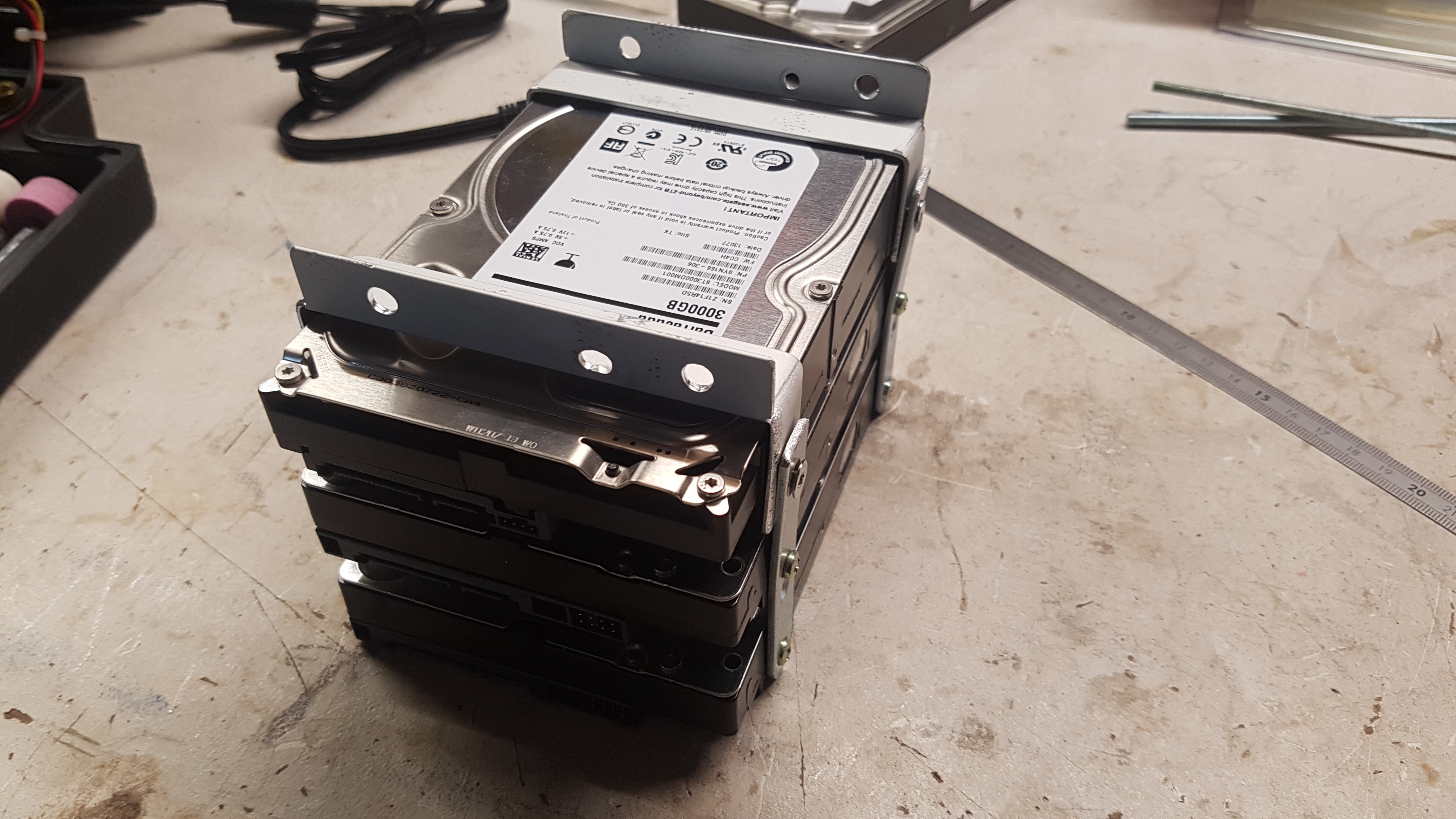 Côté boitier, j'ai dû revoir le système de fixation : sur les pattes métallique de fixations des disques, j'ai percé des nouveaux des trous pour le 3e disque. Le poids des 3 disques durs est devenu alors trop important pour être supporté par les élastiques et ils touchent désormais la CM. Après plusieurs essais, j'ai alors remplacé les élastiques par des profilés en forme de cornière métalliques posés sur le châssis du boitier sur lesquels sont fixés les disques avec des vis + écrous papillon. Ainsi il n'y a plus d'abaissement de l'ensemble. Par contre, le montage / démontage est devenu plus complexe : il n'y a pas de place pour passer les doigts, l'ensemble est plutôt lourd et ne doit surtout pas reposer sur la CM…