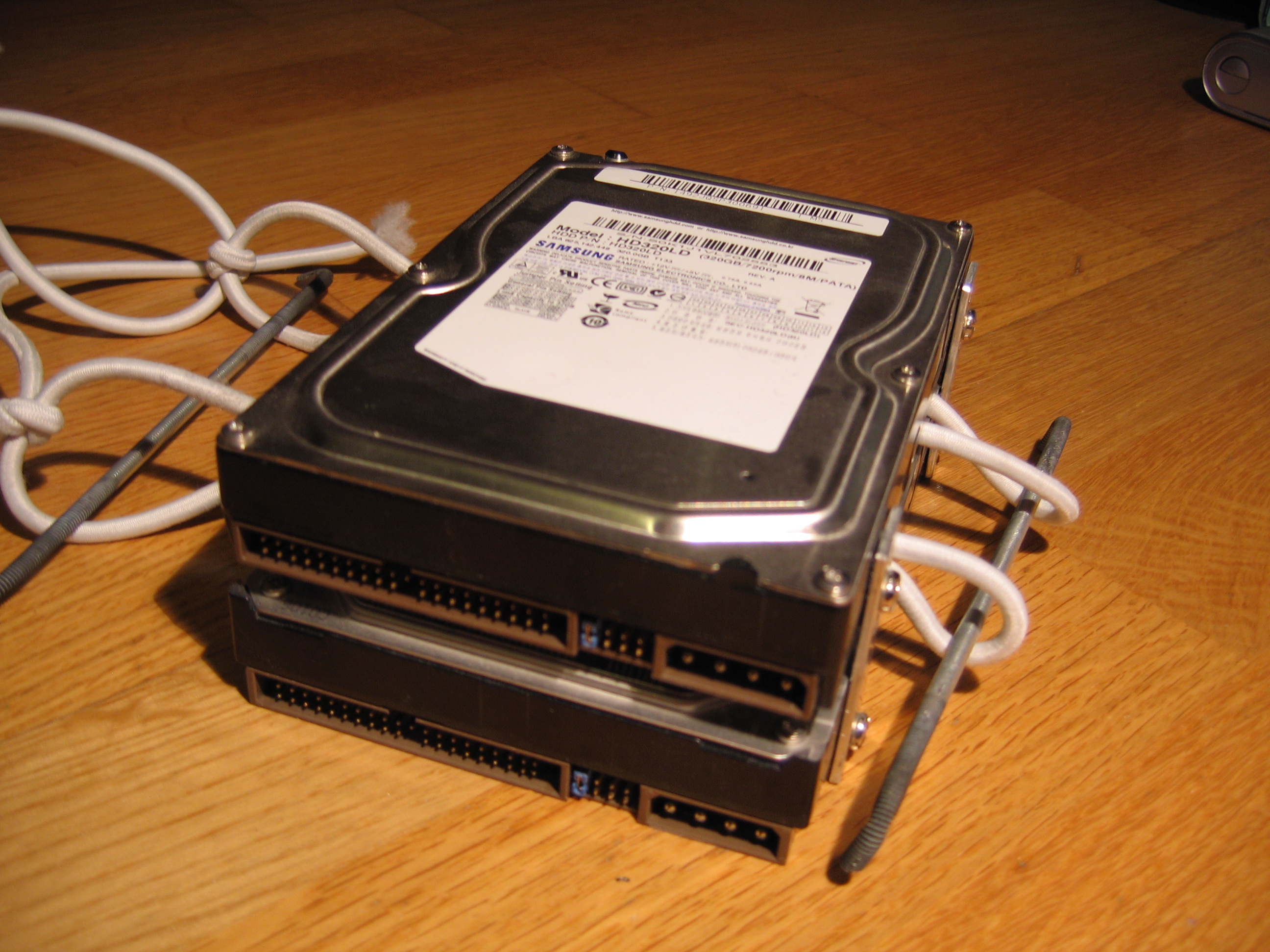 06/2008 : j'ai superposé à l'aide de plaques métallique mon nouveau disque dur (1 To en SATA) avec l'actuel (320 Go IDE) afin d'optimiser l'espace disponible. J'ai conservé le système de suspension avec les élastiques.