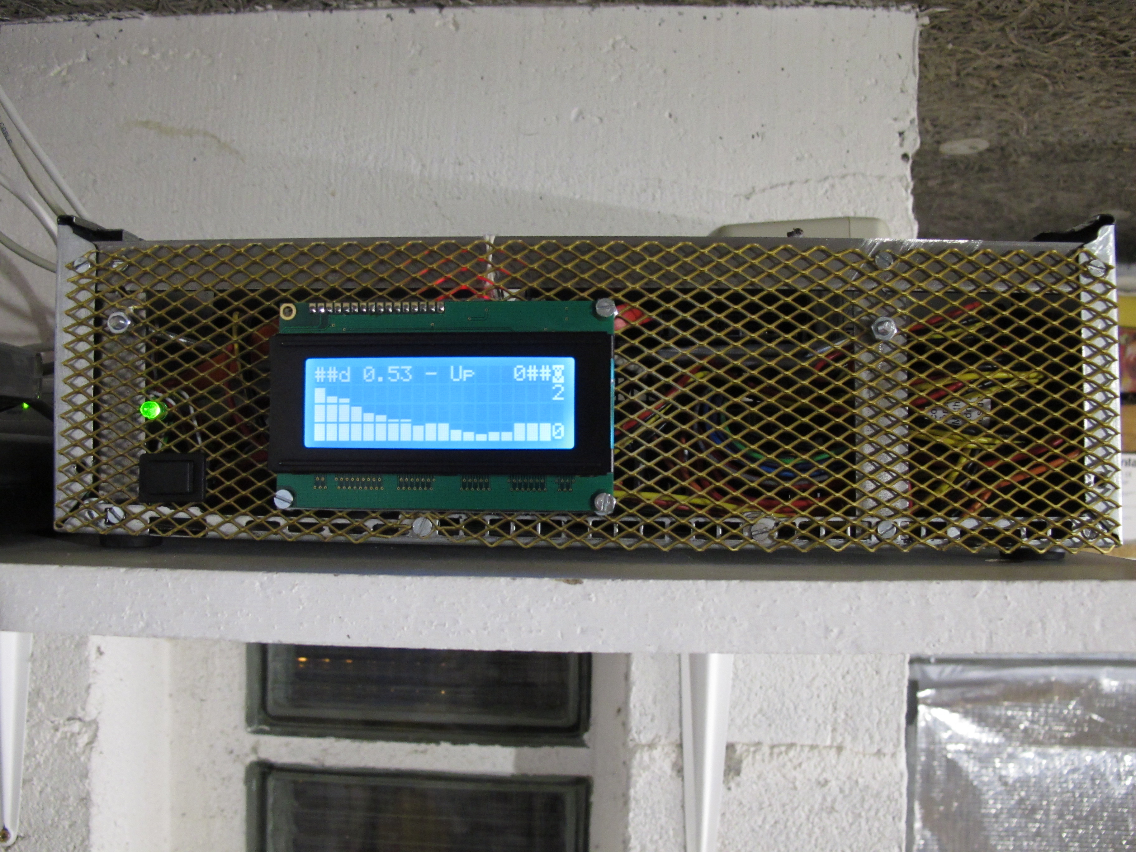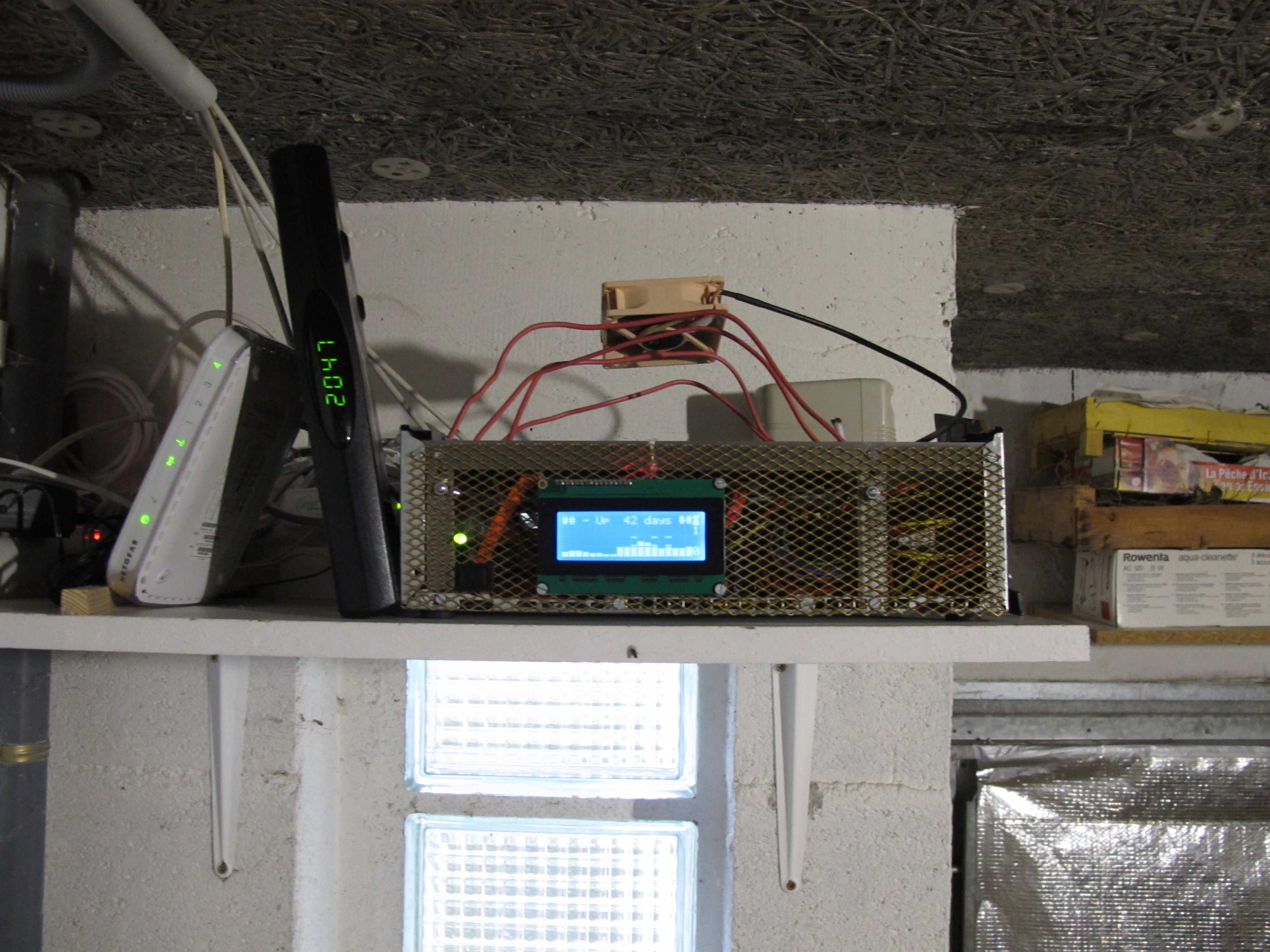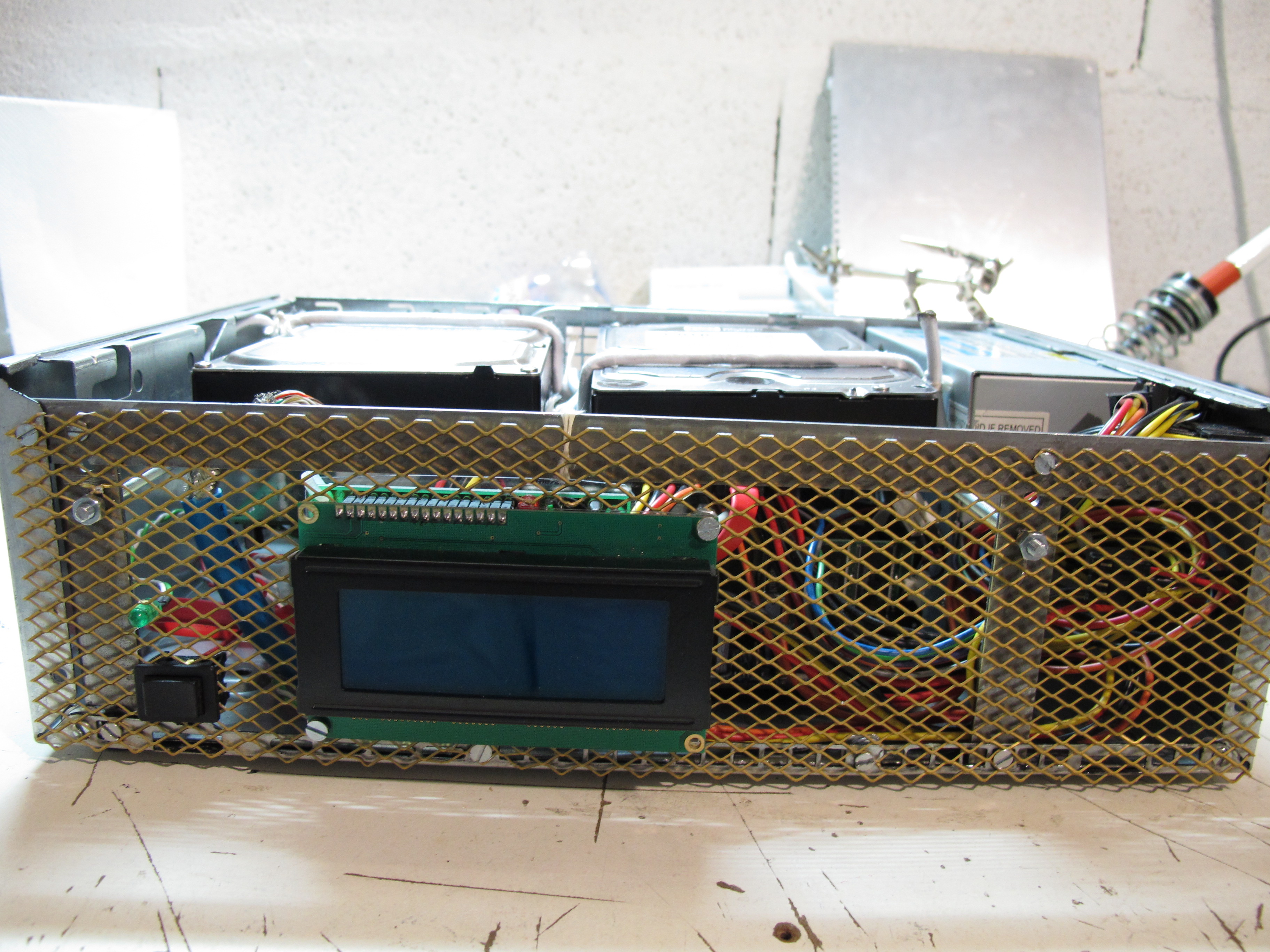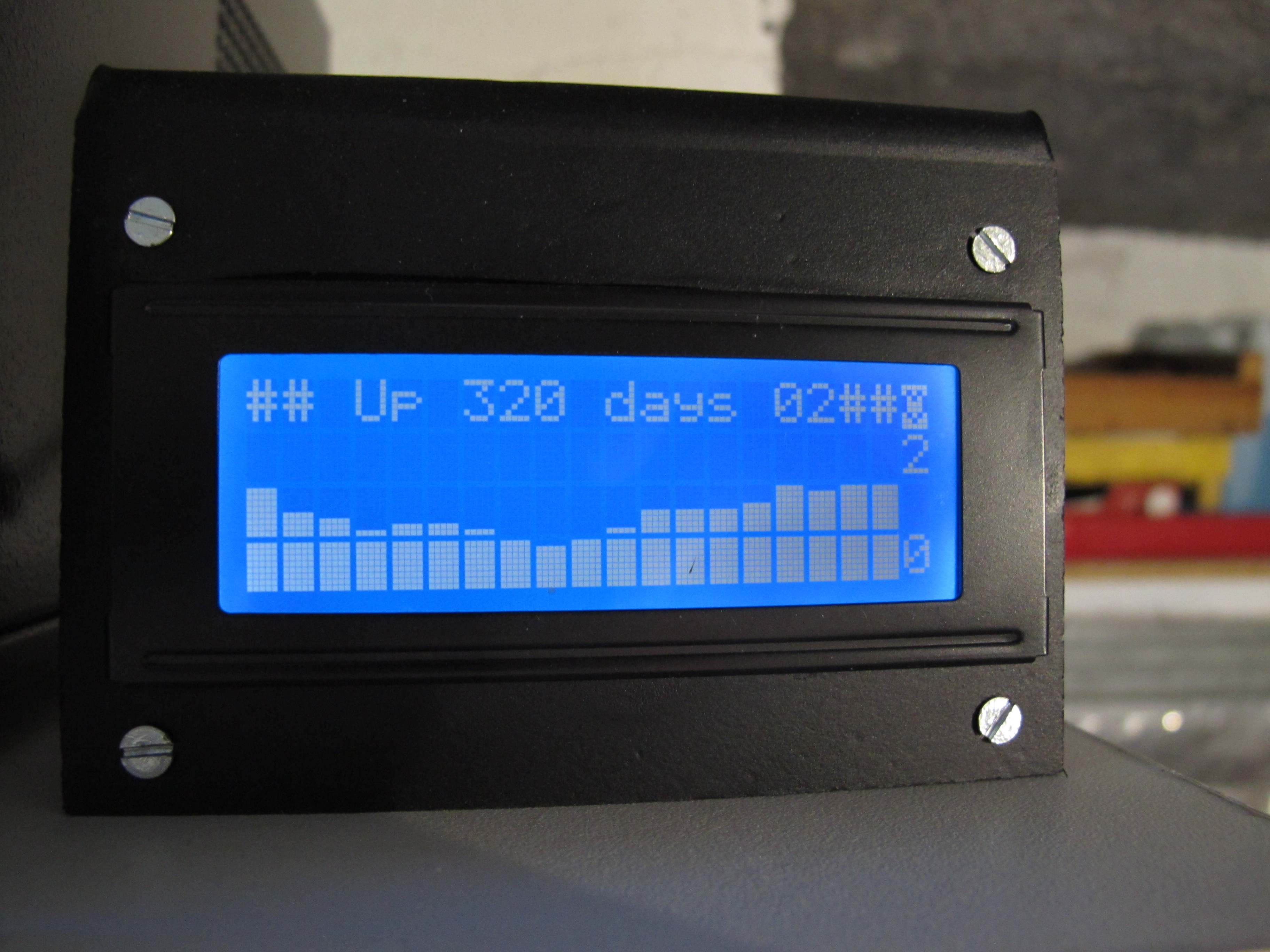03/2010 : j'ai installé le LCD initialement destiné au NSLU2 sur la façade avant. Un bargraphe représentant l'évolution du load ainsi qu'un bandeau déroulant avec l'uptime sont affichés via LCDd.
