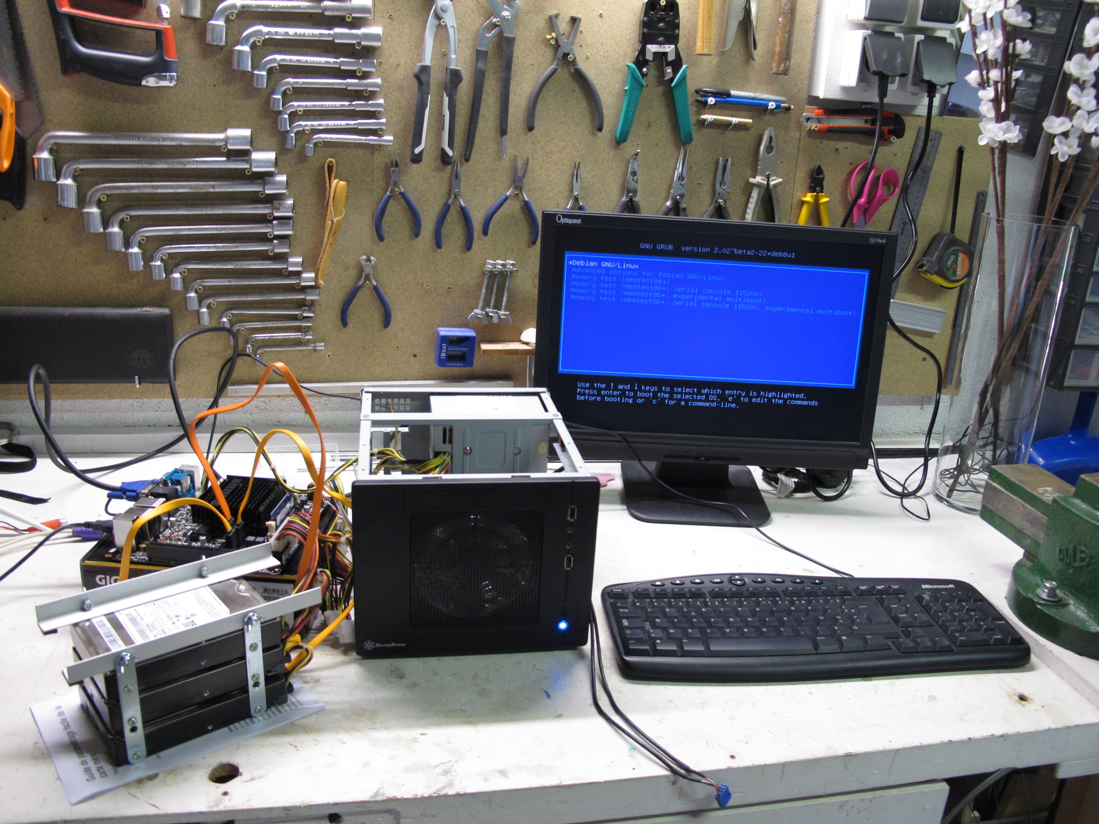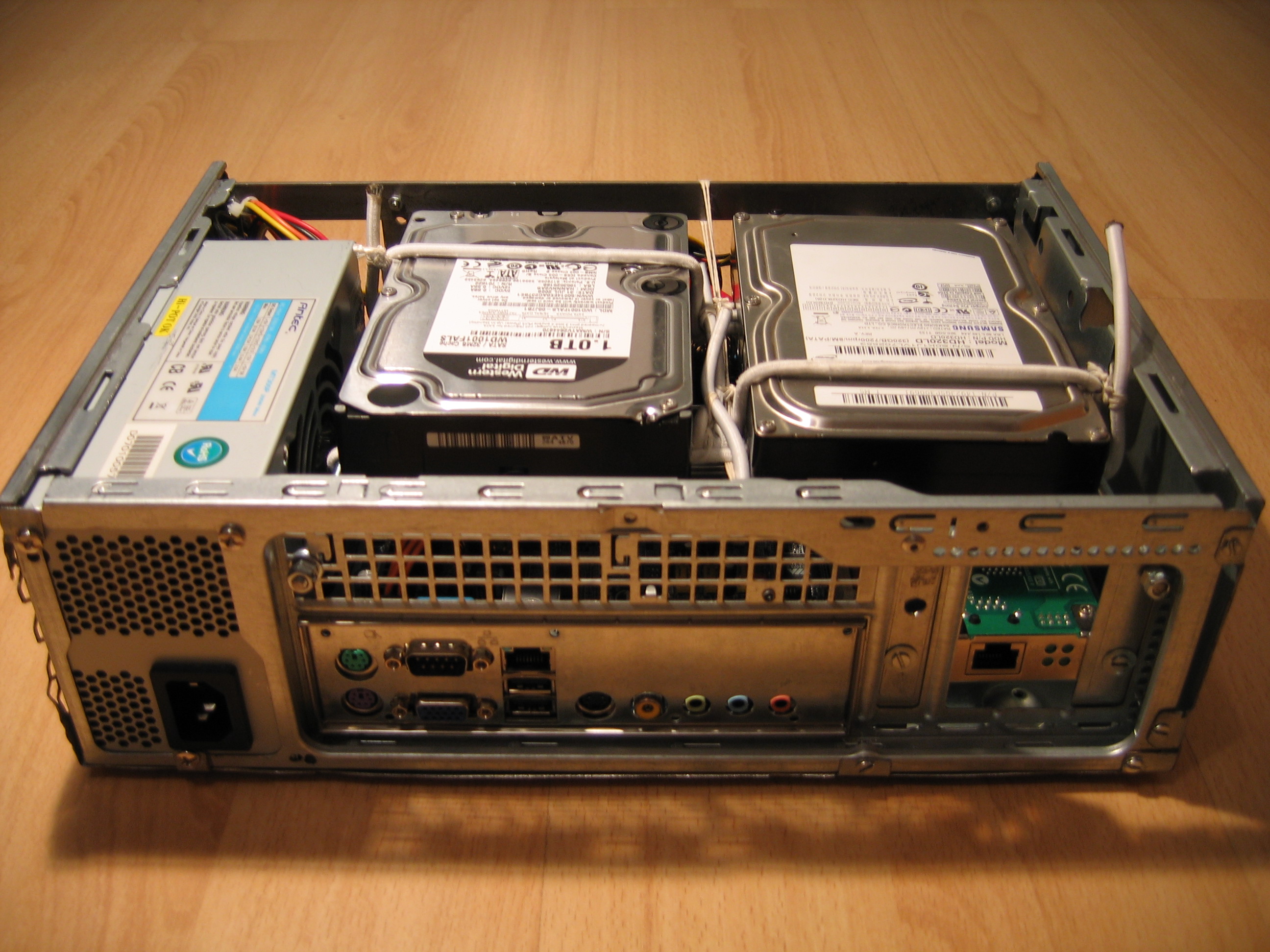07/2010 : malheureusement, le boitier est trop petit et l'ensemble chauffe beaucoup ? Les disques durs sont à 50°C. J'ai dû installer un ventilateur supplémentaire suspendu au dessus de l'ensemble en attendant de trouver mieux. De la même manière, le switch ethernet était posé sur la freebox, je les ai installé verticalement pour qu'ils améliorer la circulation d'air