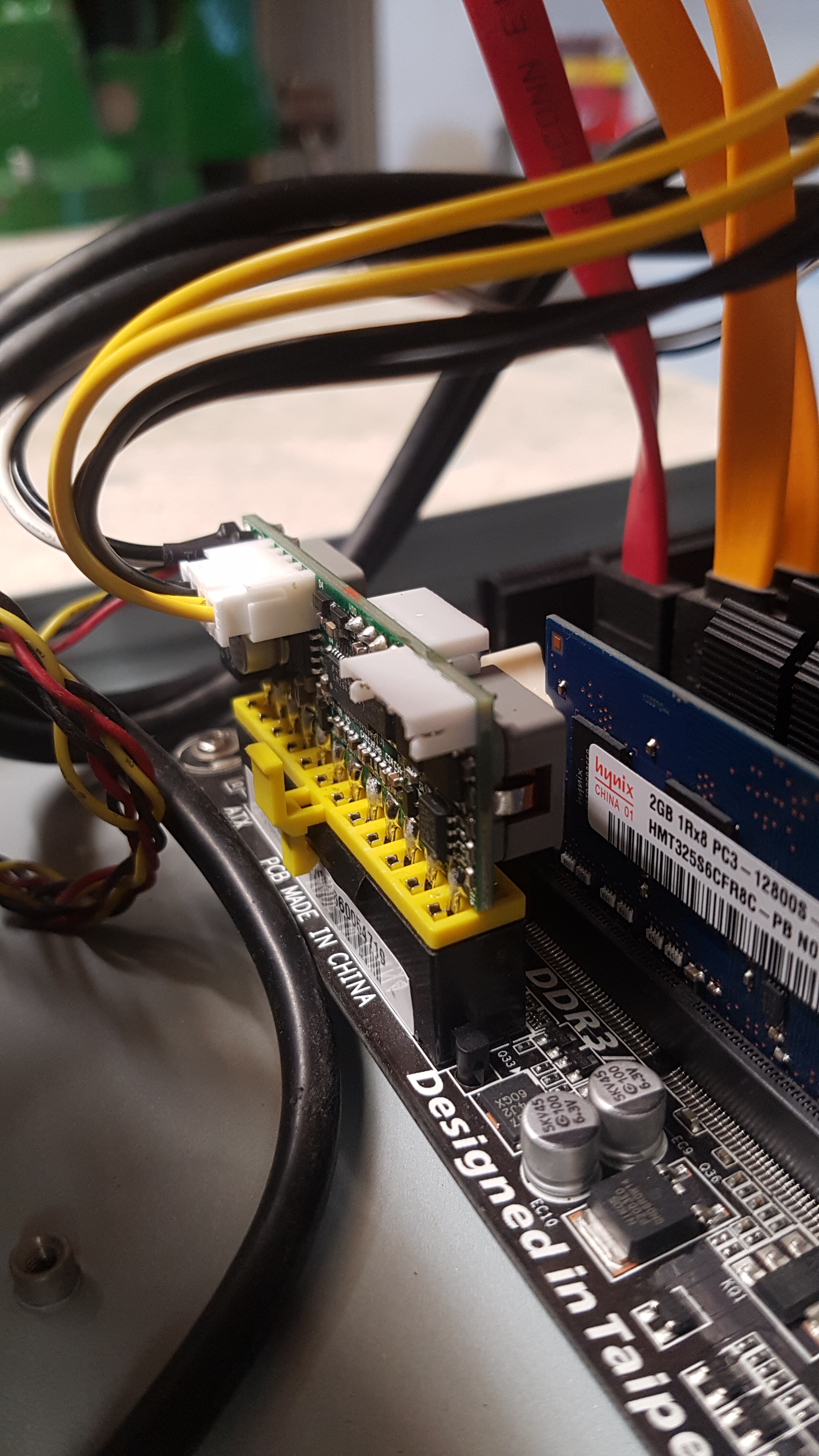 Pour gagner de la place dans le boitier, j'ai réduit la longueur de la nappe IDE. J'ai déplacé le connecteur femelle afin qu'elle soit la plus courte possible : 4 cm. En remontant la nappe, j'ai, par erreur, installé l'un des connecteurs à l'envers et ne l'ai constaté qu'après avoir branché le disque sur la CM : il n'était pas reconnu par le bios. Par chance, ni le port IDE, ni le disque n'ont subit de dégâts suite à cette bourde. En re-démontant le connecteur et en le mettant dans le bon sens, tout fonctionnait comme attendu.