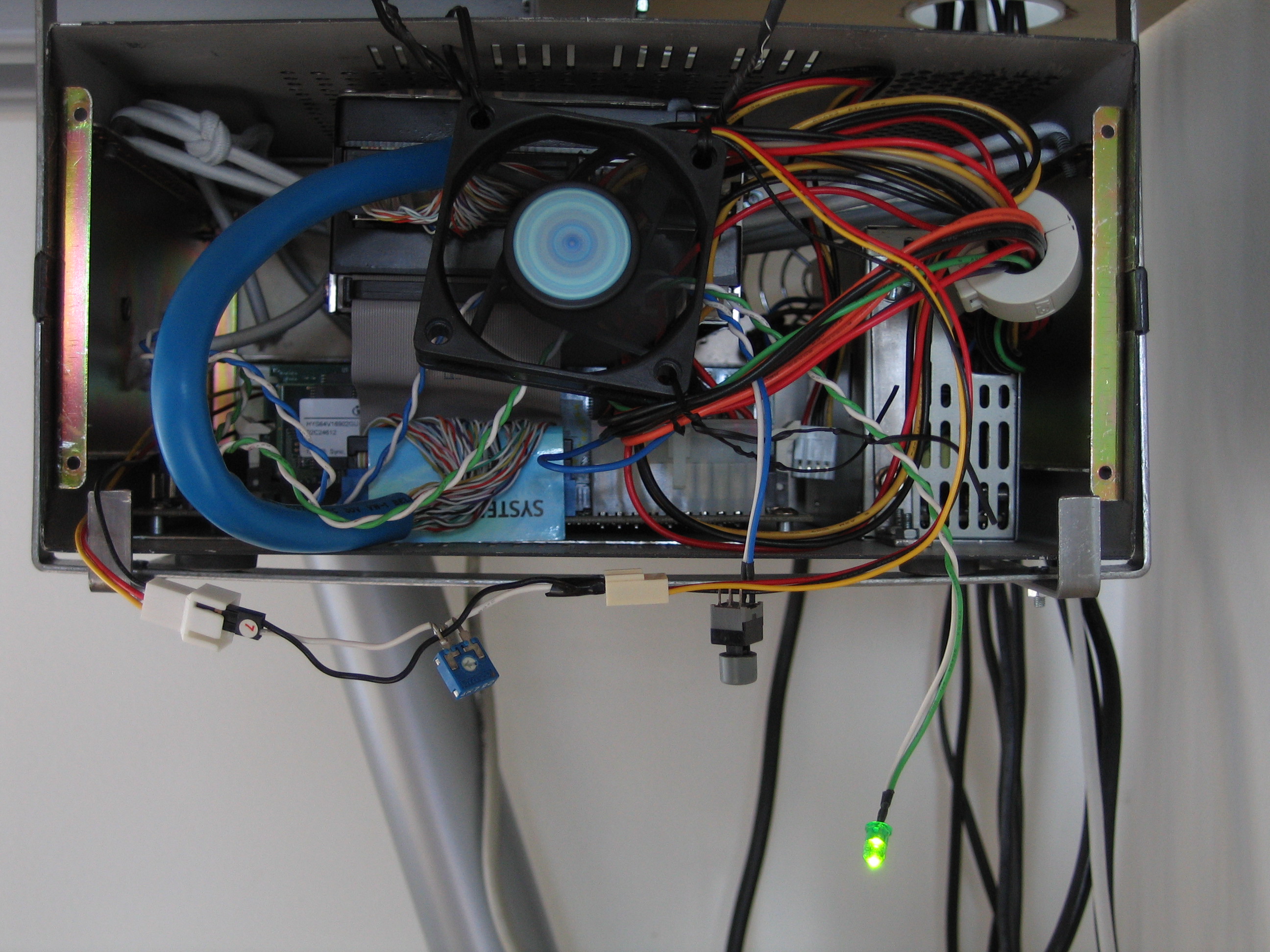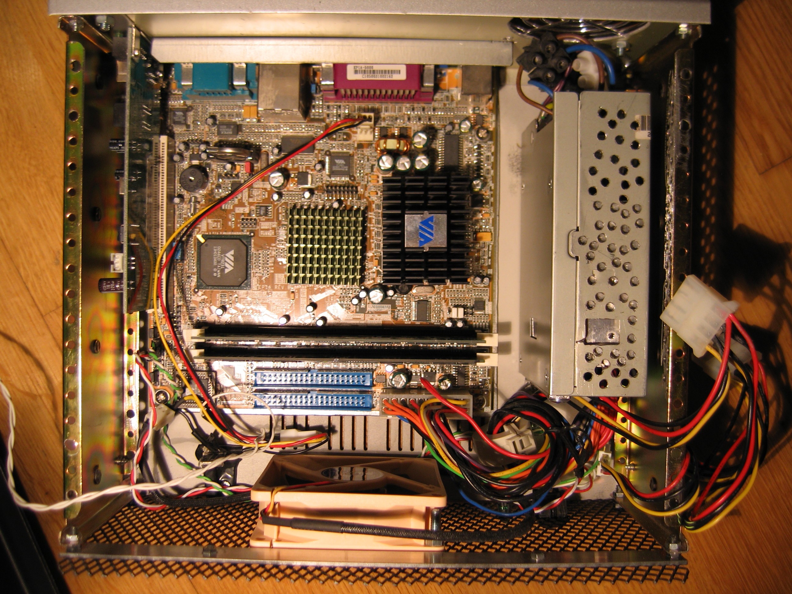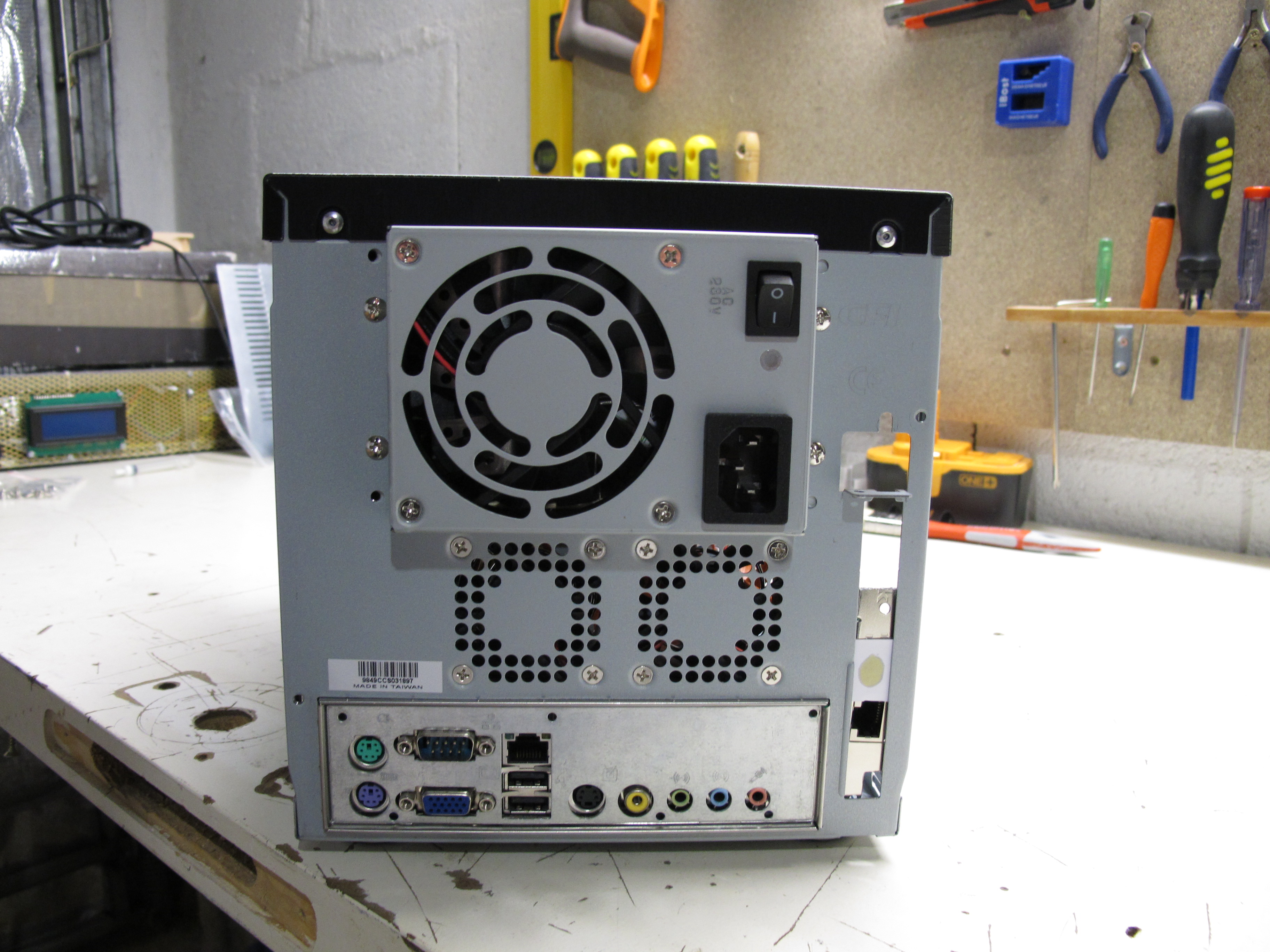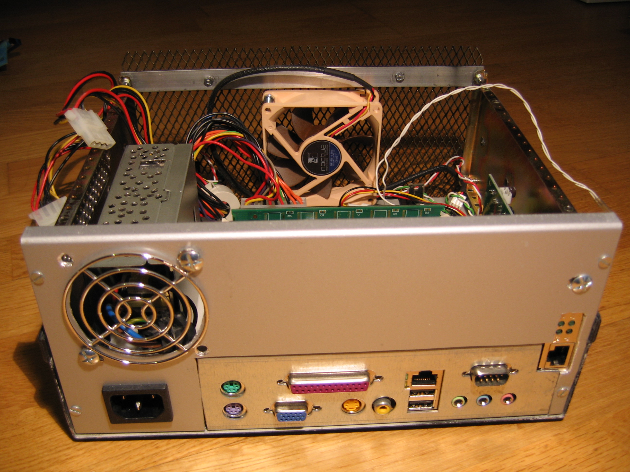 06/2008 : les températures élevées à l'intérieur du boitier m'ont conduit à ouvrir la façade avant avec une grille et un ventilateur Noctua de 80 mm. Le boitier de l'alimentation a également été percé pour améliorer la circulation de l'air
