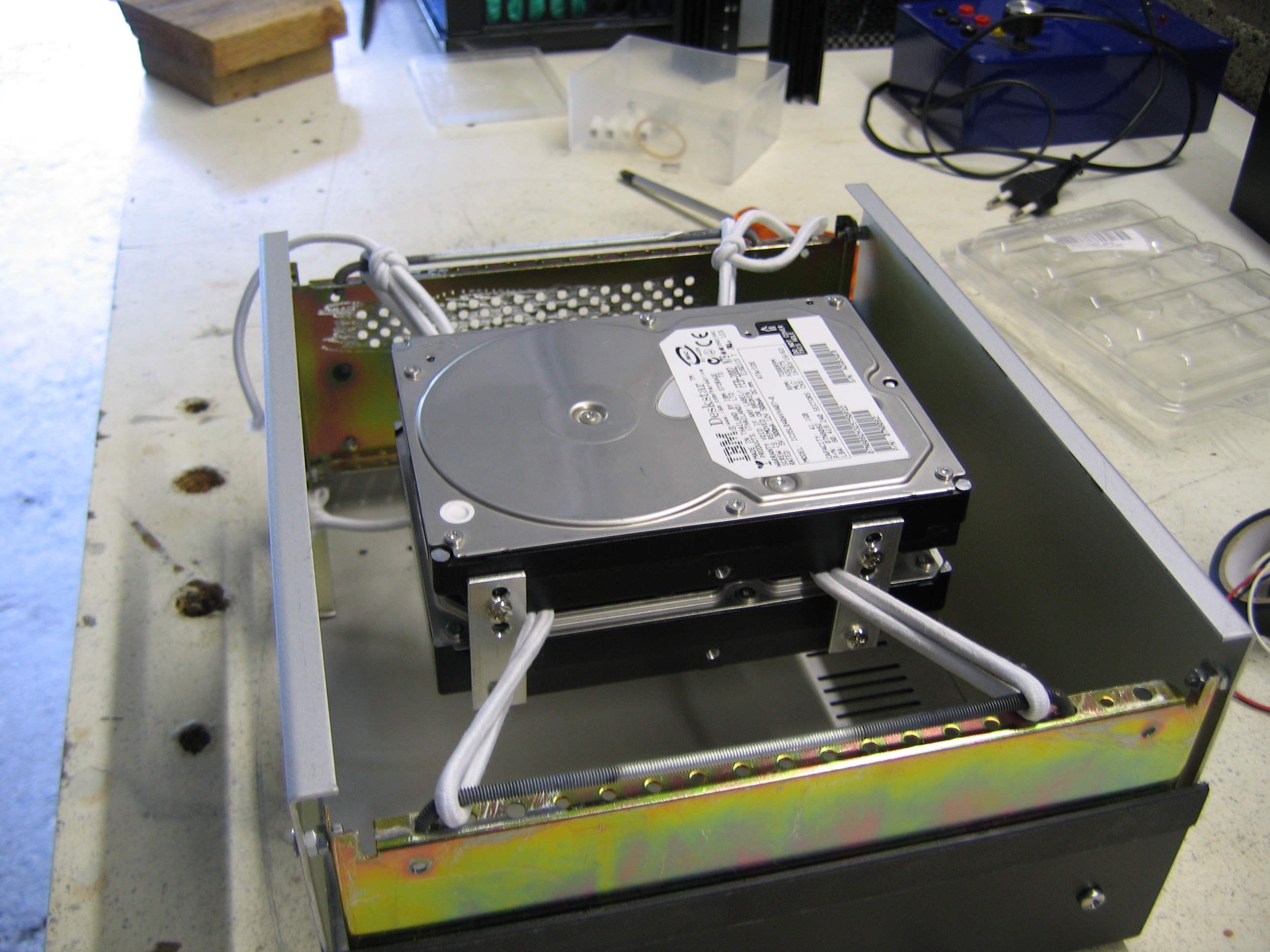 J'ai fixé le disque dur à l'aide de très gros élastique afin d'absorber les vibrations. Les supports de ces élastiques étaient constitués d'une tige filetée pliée en U à l'aide d'un brûleur à gaz de camping. Ce système de fixation n'est pas facile d'utilisation mais permet d'exploiter au maximum la place du boitier tout en limitant le bruit.