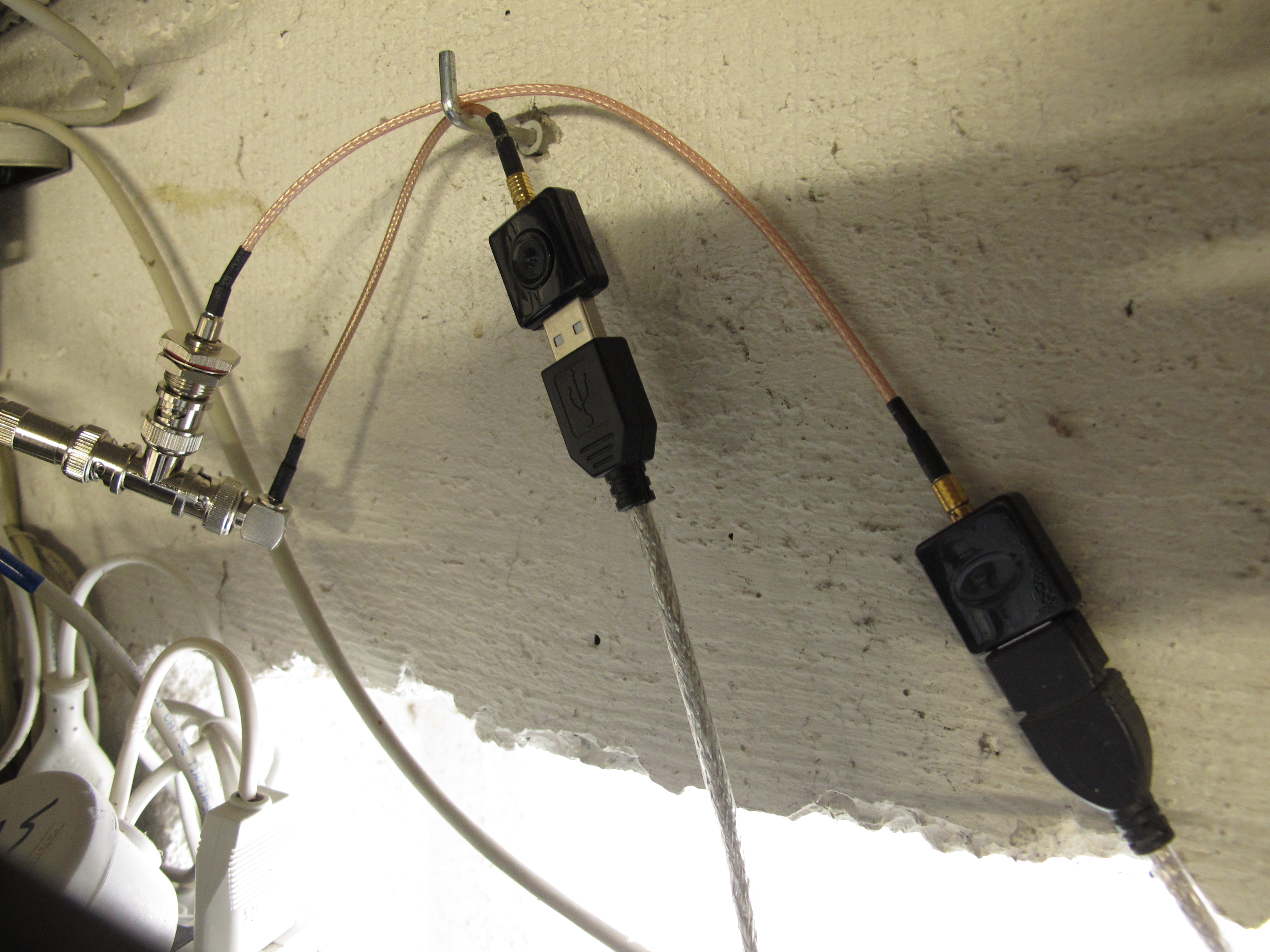 03/2018 : en changeant de carte, je suis passé à 2 cartes USB et j'ai donc adapté le système de connexion MCX pour brancher les 2 dongles USB, il n'y a pas plus de gros câble d'antenne après le T.