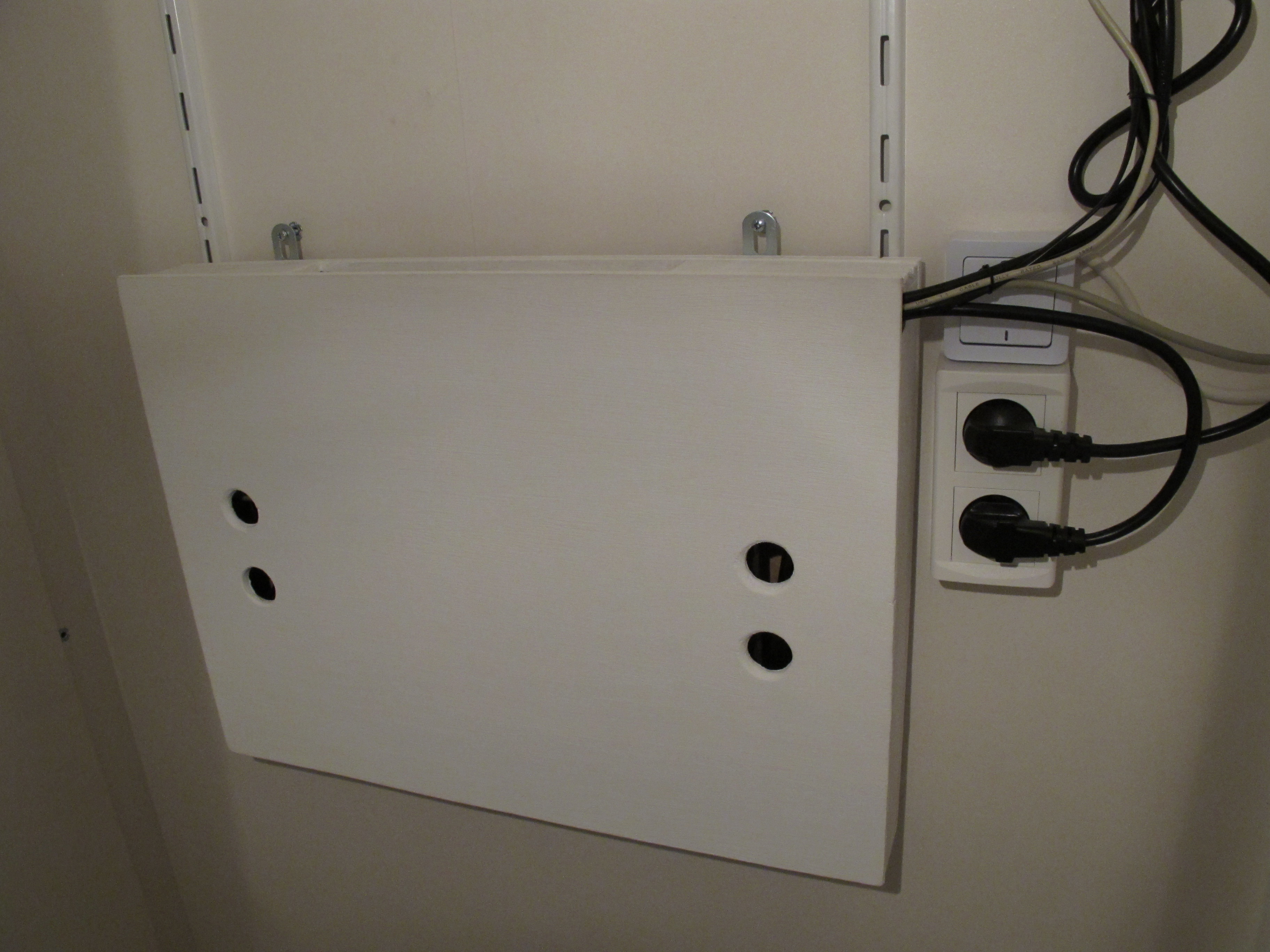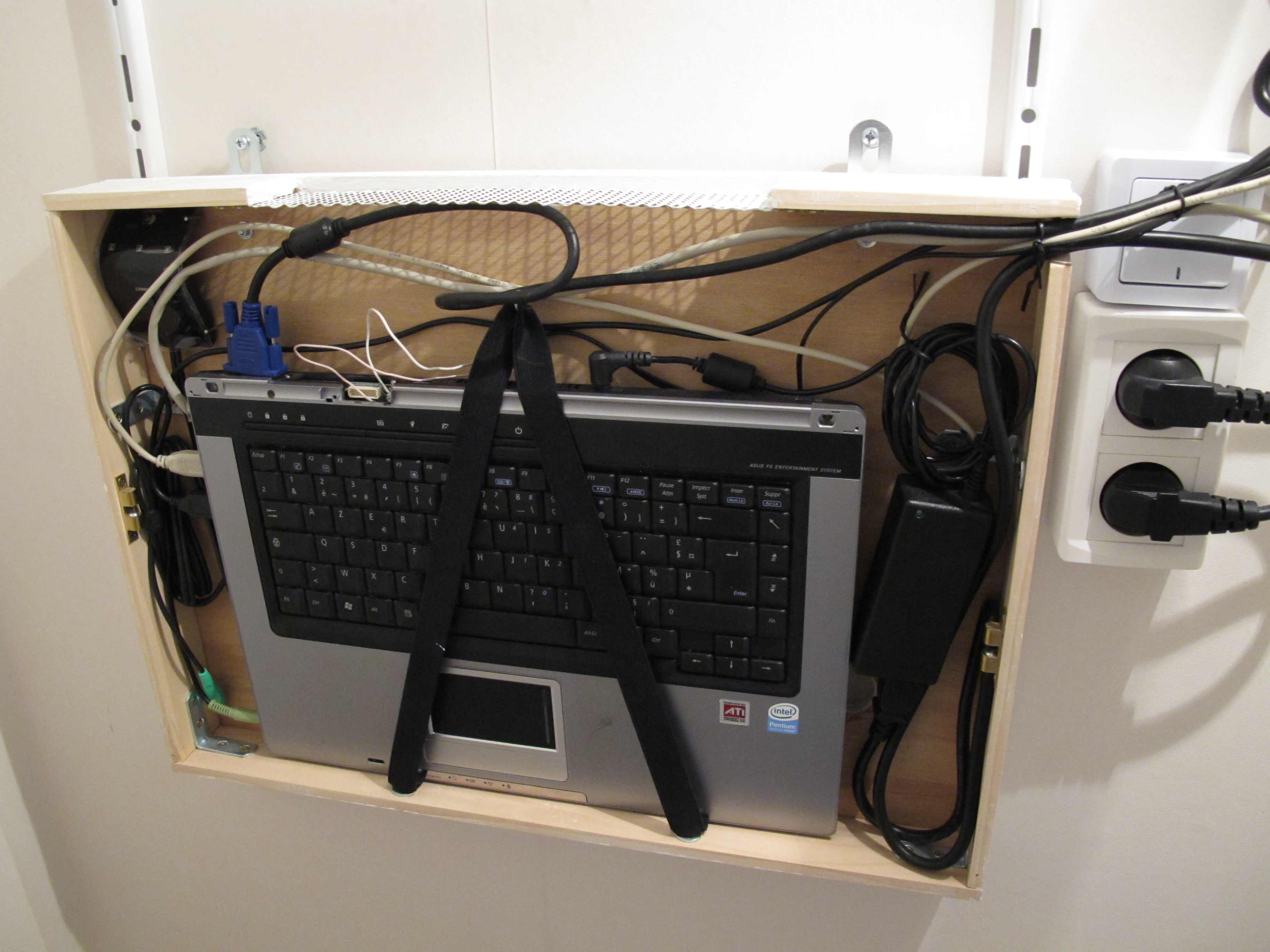 J'ai fabriqué et installé de l'autre coté du mur une boite en boite en bois faite sur mesure. Elle permet de ranger verticalement l'ordinateur portable, le recepteur sans fil ainsi que le bloc secteur d'alimentation sans trop empiéter sur le rangement du placard dans lequel elle est fixée. Sur la face supérieur, une grosse grille d'aération autorise la circulation d'air.