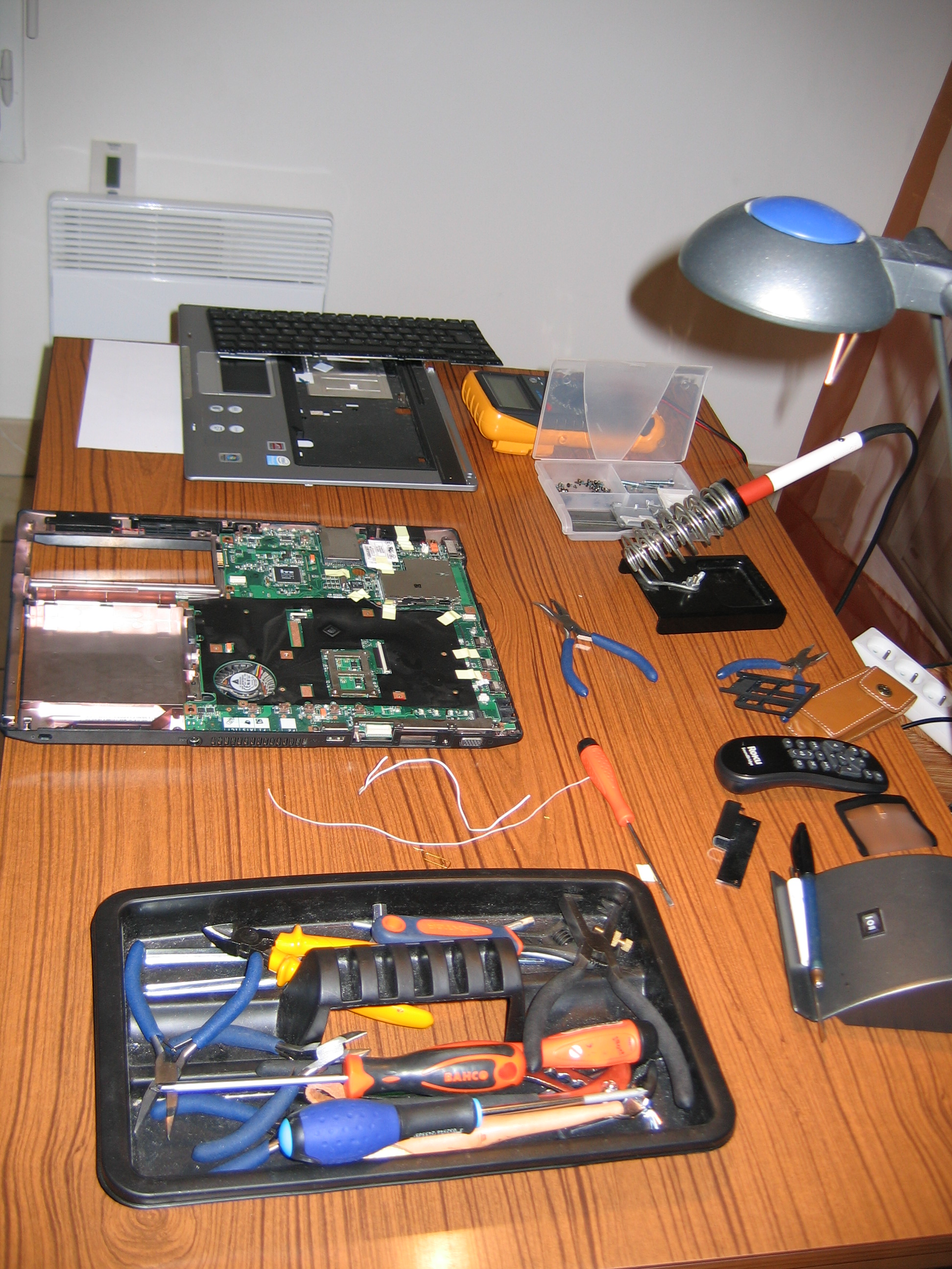Comme l'unité centrale ne va pas être accessible, il faut déporter le bouton d'allumage avec un long fil. Après avoir démonté le PC portable et accéder à la carte mère, j'ai soudé un long fil + bouton poussoir en parallèle du bouton d'origine. J'en ai profité pour démonter l'écran cassé